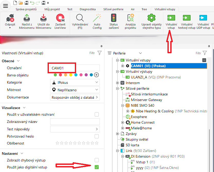 Nejdříve si vytvořte Virtuální vstup: ve stromu periferií klikněte na virtuální vstupy, pak nahoře v pásu příkazů na Virtuální vstup; ten pak pouze pojmenujte, ideálně nějak JEDNODUŠE, bez češtiny a mezer apod. – v mém případě CAM01 a zaškrtněte, že to má být digitální vstup. To je vše.